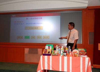 在台湾学习期间,学员们还在统一企业开展实地调研。统一企业成立于1961年,1992年进入大陆市场。从以食品制造为主体的传统企业,发展到现在涉及制造,流通,贸易,证券及投资五个领域的企业集团。统一集团副总裁赖平凉先生致欢迎词,向学员们介绍了统一企业集团的发展规划远景,企业的发展状况,运营状况,企业责任,以及“三好一公道”的企业理念;海外投资副总监杨代今先生为学员们播放了集团宣传演示片,对企业集团海外投资状况,食品安全,创新发展,企业产品等进行了详细的介绍;学员们还积极与统一集团赖凉平副总裁和杨代今副总监进行面对面的交流,高新投资集团董事长汪洋就统一企业集团如何进行品牌管理降低企业生产经营风险问题、阳光电源有限公司副总经理张有权就统一企业五大事业部与总公司的财务运营情况、瑞福祥食品有限公司人力资源部长田启梅就统一企业与供货商企业进行交流和提供技术支持等问题与两位高管进行深入探讨。