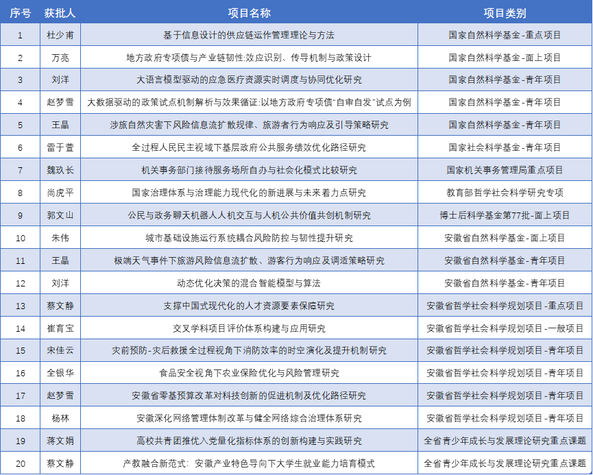 近日,国家自然科学基金委员会、全国哲学社会科学工作办公室、教育部社会科学司、中国博士后科学基金会及安徽省相关部门陆续公布了2025年度科研项目评审结果。我院教师共获批立项20项,包括国家自然科学基金重点项目1项,面上项目1项、青年项目3项,国家机关事务管理局重点项目1项,国家社会科学基金青年项目1项,教育部哲学社会科学研究专项1项,中国博士后科学基金面上项目1项以及安徽省各类项目11项。其中国家自然科学基金重点项目为我院教师首次获批项目,标志着学院国家级科研项目立项再获新突破。