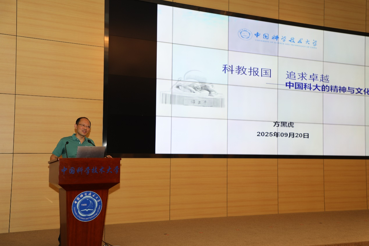 学校档案文博院执行院长方黑虎以《科教报国 追求卓越——中国科大的精神与文化》为题,围绕中国科大的精神溯源,文化标识中的科大精神,科教报国:科大精神的价值取向,追求卓越:科大精神的实践路径四个部分展开讲解。他深入阐述了抗大精神、“两弹一星”精神、科学家精神共同孕育了“科教报国、追求卓越”的科大精神;他回溯了中国科大的创校历程,详细解读了校徽、校训、校风、校歌的深刻内涵,指出科大精神与红专并进的校训一脉相承;通过学习抗战中的科大先生和新时代的科大校友的先进事迹,他指出科大人对科大精神矢志不渝的坚守与代代相传;通过介绍中国科大教育创新、科技创新、人文关怀等方面的创举,他道出了科大精神历经67年坚持不懈的伟大实践。