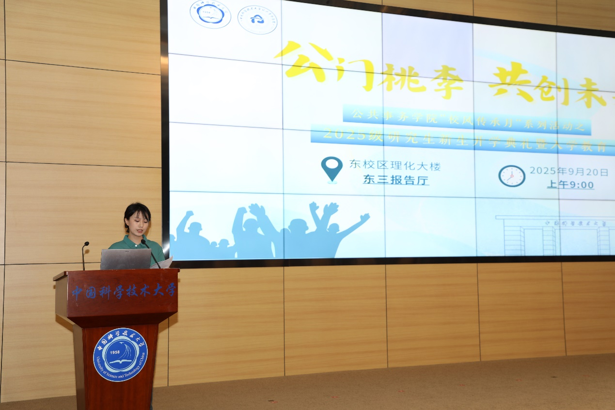 党委副书记蒋文娟以《聚焦立德树人 促进全面发展》为题,从校纪校规管理、学生安全教育、心理健康教育、评奖评优、职业生涯规划五个方面进行了详细介绍。她向新生解读了《中国科学技术大学学生违纪处分管理规定》等规章制度,聚焦电信诈骗、宿舍用电安全等重点领域,结合案例与数据,着重强调了安全防范的重要性。她全面介绍了校、院评奖评优体系,鼓励同学们不断奋勇向前。最后,她勉励全体新生珍惜研究生阶段的宝贵时光,自觉遵守校规校纪,锚定目标砥砺奋进,不断打造自身核心竞争力。