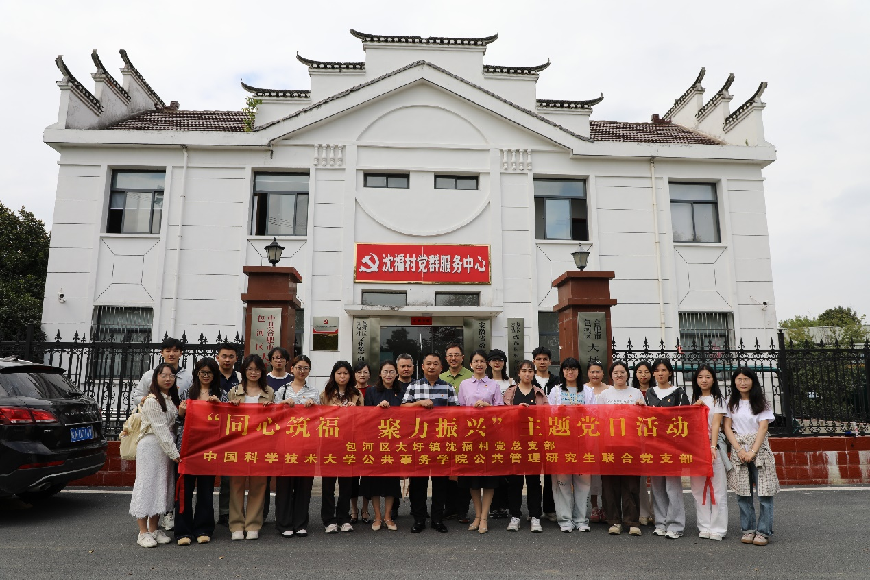 为深入学习习近平新时代中国特色社会主义思想,贯彻落实习近平总书记关于青年工作的重要思想,引导和帮助广大青年学生在社会实践中受教育、长才干、作贡献,带领青年学生深入了解乡村治理现状,探索乡村治理新思路和乡村振兴新路径,9月22日下午,在学院党委副书记蒋文娟、党支部书记宋小燕带领下,公共管理研究生联合党支部全体成员前往合肥市包河区大圩镇沈福村开展“同心筑福,聚力振兴”党建共建活动,大圩镇沈福村党总支部书记陆军华等人热情接待。