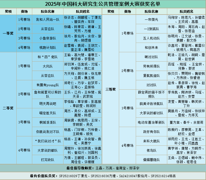 经过多轮激烈角逐与评审团综合评议,本次决赛最终评选出一等奖4名、二等奖12名、三等奖16名,最佳指导老师奖4、最有价值队员奖4。作为学院连续五年举办的赛事,本次公共管理案例大赛已圆满落幕。未来,学院将持续深耕赛事育人路径,以赛促练、以评促优,不断夯实实践教学根基,助力学院学生在公共管理领域锤炼过硬本领、践行知行合一的初心,以赛育能、以赛育才,让实践教学成为培养优秀公管人才的坚实支撑。