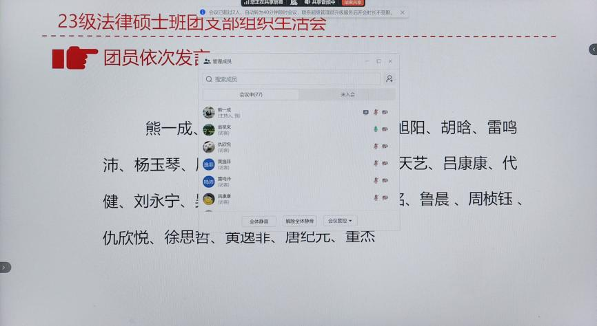 深入学习贯彻习近平新时代中国特色社会主义思想,全面贯彻落实党的二十届四中全会精神2023级法律硕士班团支部于36日下午通过线上会议开展了2025年度组织生活会暨团员评议会。会议由团支部书记熊一成主持,团支部全体成员参会,班主任秦洁老师和院团委学生兼职副书记朱谊出席会议。