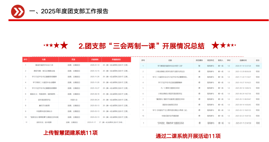 会议在庄严的团歌声中拉开了序幕。团支书熊一成代表支委会作年度工作报告,全面回顾2025年度团支部在主题教育实践活动、“三会两制一课”、特色团日活动等方面的情况,直面工作中的不足,并明确了今后努力改进的方向。